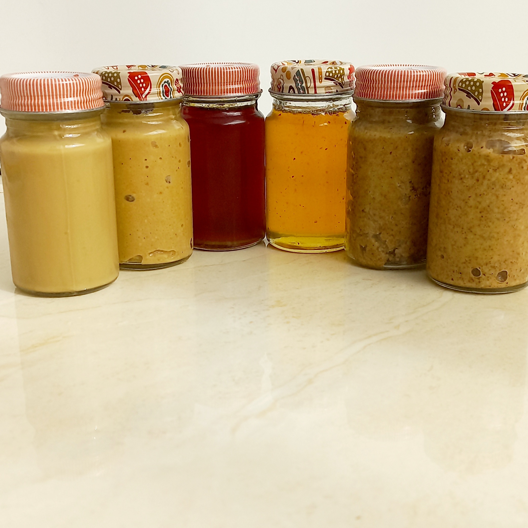 ۶ محصول (کره بادام مامایی، کره بادام زمینی، کره گردو، ارده، عسل، شیره انگور)